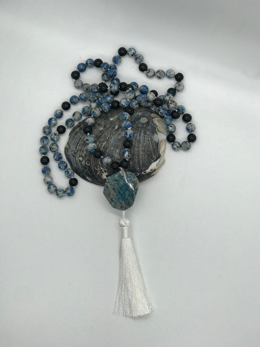 Mala prayer beads created with Blue Spotted Agate beads